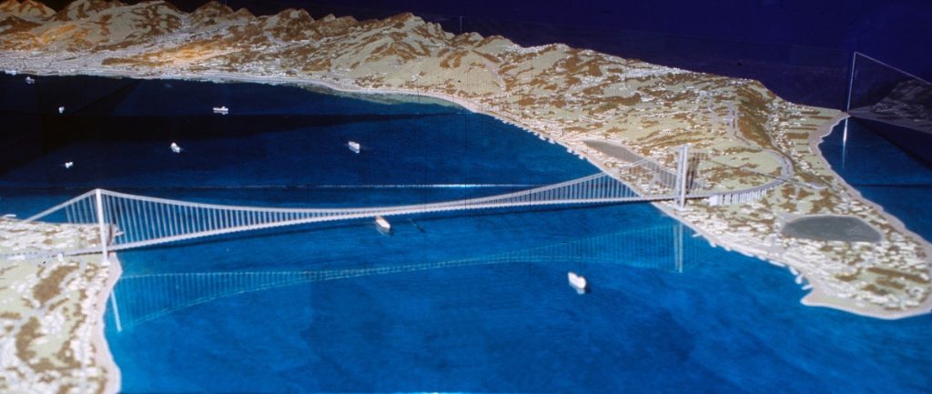 Il progetto varato prevede la costruzione di un ponte sospeso, che sarebbe il più lungo del mondo. La lunghezza complessiva raggiungerebbe infatti i 3.666 metri, con una campata sospesa di 3.300 metri. L’impalcato previsto sarà largo circa 60 metri, mentre le due torri poste a terra saranno alte 399 metri. Il sistema di sospensione sarà formato da due coppie di cavi, del diametro di 1,26 metri ciascuno.