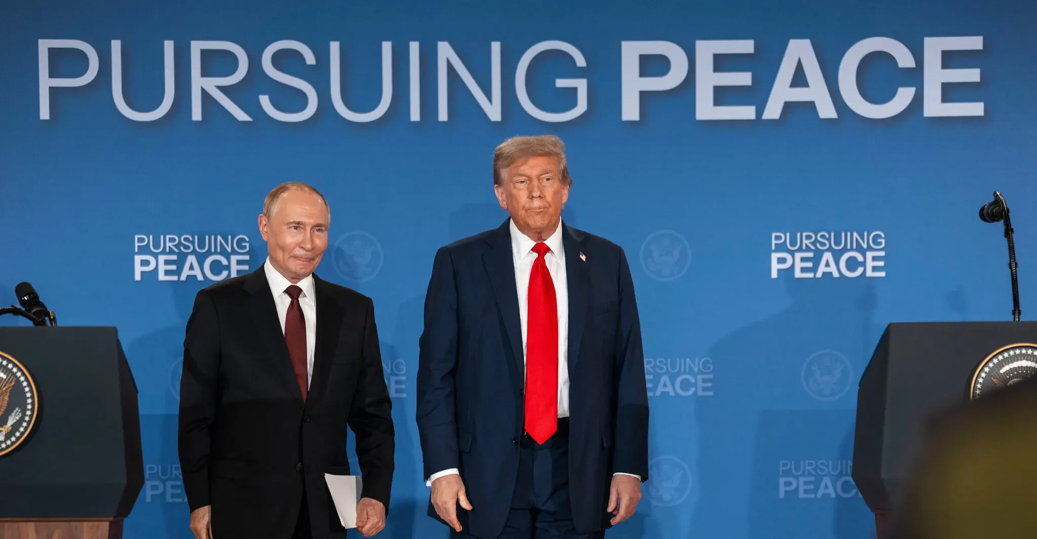 Quasi tre ore di vertice, in una sala dove campeggiava la scritta beffarda Pursuing Peace, alla ricerca della pace, una pace che Vladimir Putin e Donald Trump in realtà hanno deciso di non decidere di ricercare, ed i colloqui si sono conclusi con uno sconcertante nulla assoluto.